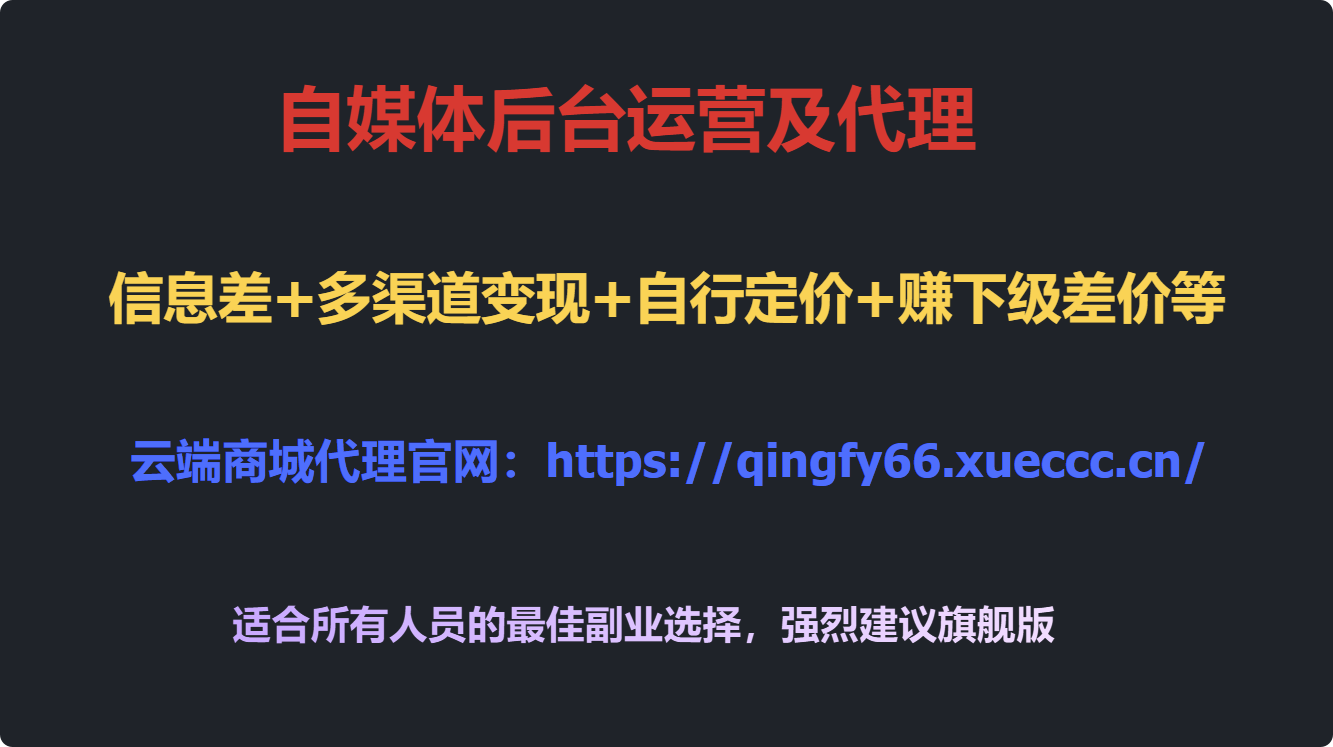 包含公众号、视频号、快手、抖音、闲鱼、京东、淘宝等各大平台,限时招代理服务,或者自行点击查看是否适合自己,该云端商城旗舰版是后台最低价,如有需要,强烈建议“旗舰版”,详情点击下方链接,免费获得云端商城网站运营技巧方法手册,让您更快地进行变现,每天稳定收入200+。
